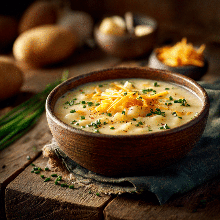This soup is everything I love about comforting, homemade meals simple ingredients coming together to create something deeply satisfying. The potatoes simmer until tender, the garlic releases its mellow aroma, and the cheddar melts into a velvety blend that feels both rustic and indulgent. It’s the kind of soup that brings people to the table without a word, just the promise of warmth and good flavor.